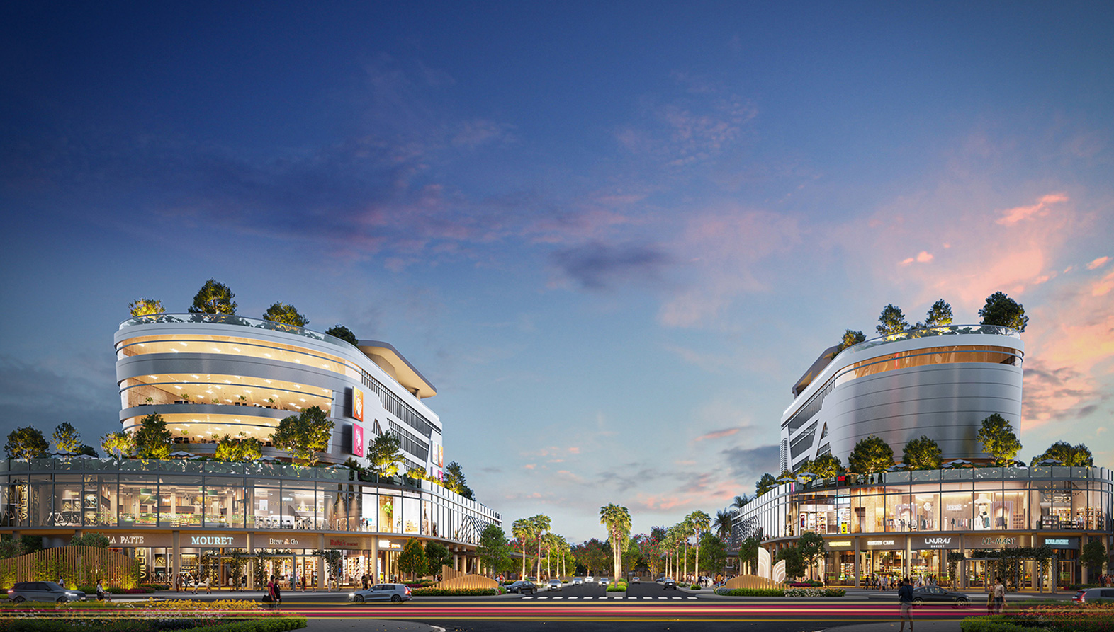 Nơi cư dân thỏa sức mua sắm, giải trí với chuỗi thương hiệu nổi tiếng, siêu thị, nhà hàng, café, bar đa phong cách. Cổng chào uốn lượn lấy cảm hứng từ dòng nước, trở thành điểm nhấn ấn tượng và cảm hứng xuyên suốt cho thiết kế cảnh quan dự án.