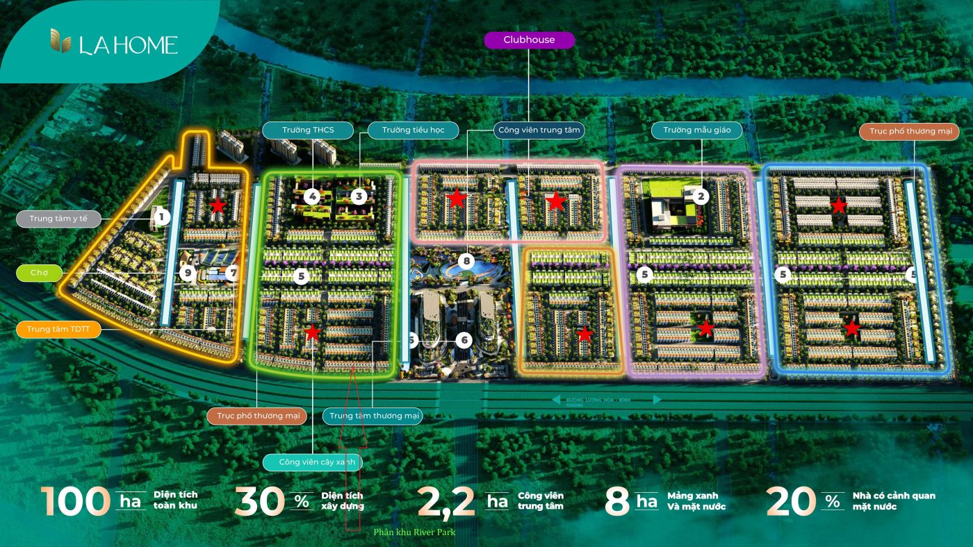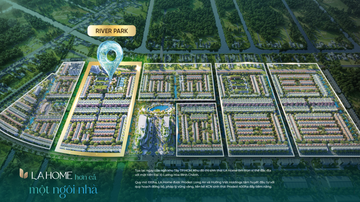 Toàn bộ LA Home là một “thành phố nhỏ” thì River Park chính là trái tim – nơi được bao quanh bởi kênh nước xanh mát, liền kề Công viên Trung tâm 2,2 ha và Trung tâm thương mại. Phân khu này chiếm 19% tổng diện tích, được thiết kế để cư dân vừa sống xanh, vừa dễ dàng kết nối mọi tiện ích chỉ trong vài phút đi bộ.